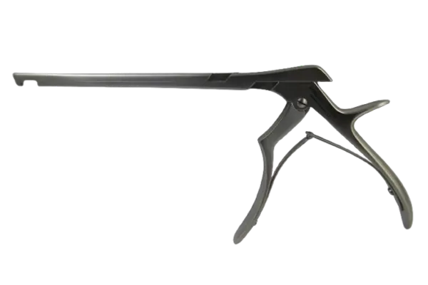 Abordaje y Laminectomía: Pinzas gubias y pinzas de corte óseo (Kerrison, Love-Gruenwald, Cushing) con diferentes ángulos y aperturas para descompresión.